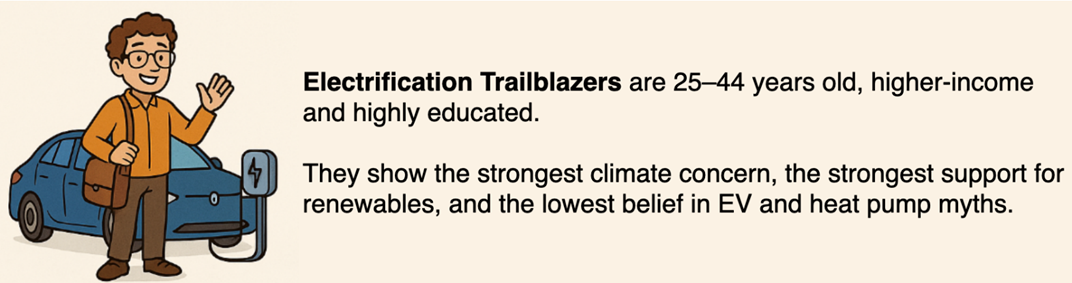 This growing group comes almost entirely from two of HETS’s six marketing segments: Electrification Trailblazers and Pragmatic Adopters. These people are by far the most likely to own or be willing to seriously consider EVs, rooftop solar, heat pumps, home batteries, time-of-use tariffs and flexibility services.