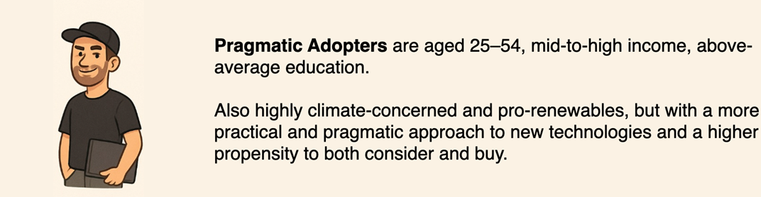 Of these segments, the Pragmatic Adopters are the fastest-growing group, rising from 10% to 17% of homeowners in the past two and a half years. This goes beyond how we defined the groups: it shows real market movement and building momentum. And that's great news for energy companies, installers and suppliers who are trying to sell energy tech to homeowners.