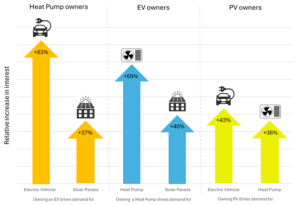 The data is stark. Analysis available to HETS clients shows the strong influence of network effects on the adoption of electrified technologies. Households that already have one or more items of clean tech are significantly more likely to buy another. HETS quantifies this so you know what to focus on. In the UK, heat pump owners are 83% more likely to want a BEV for their next car compared to non-heat pump owners. BEV owners are 69% more likely to want a heat pump compared to those who don’t own a BEV. Likewise, already owning a BEV lifts consideration of solar panels by 40%.